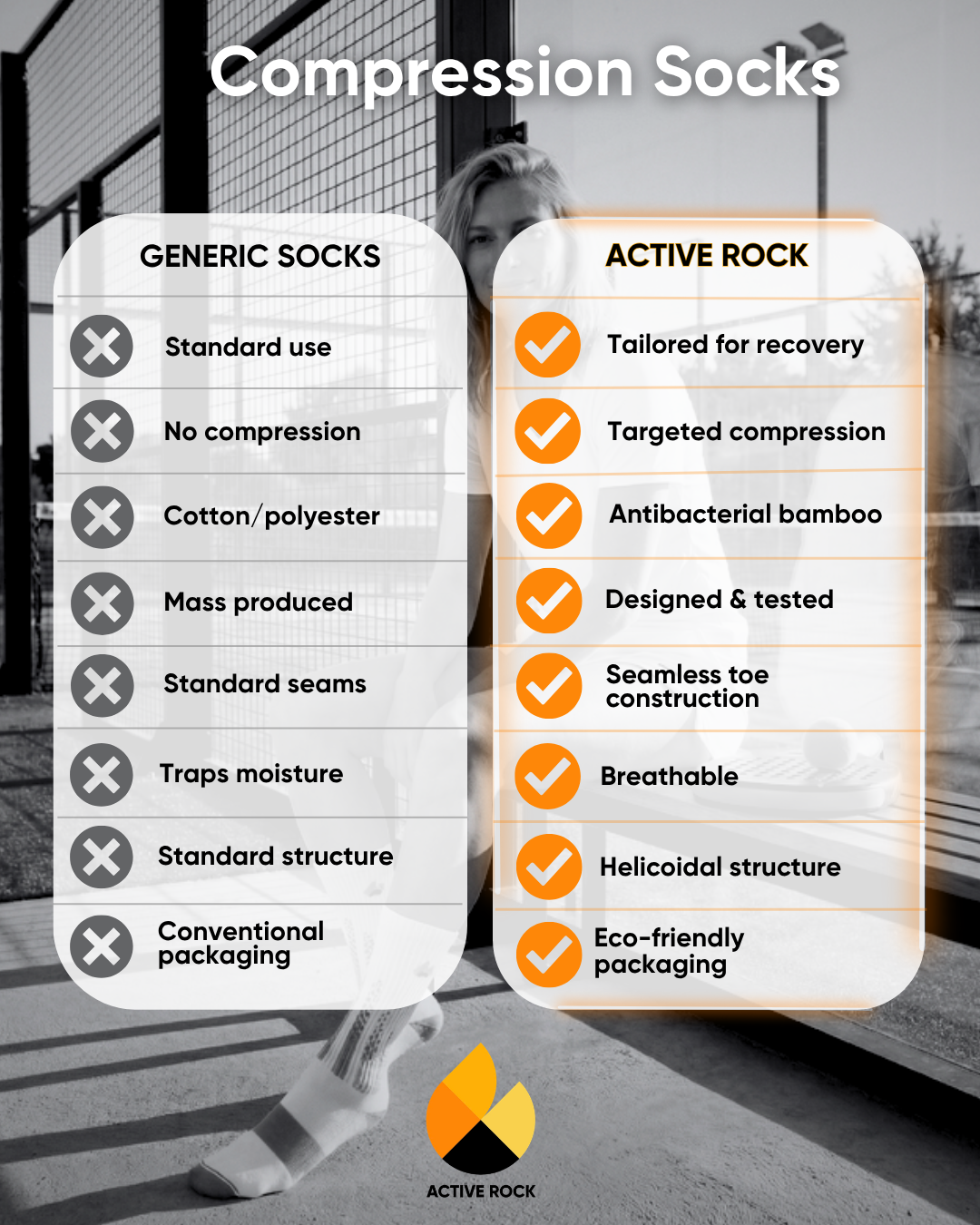 Découvrez la différence Active Rock : nos chaussettes de compression sont conçues pour les athlètes qui exigent le meilleur de chaque entraînement et de chaque jour de récupération.
